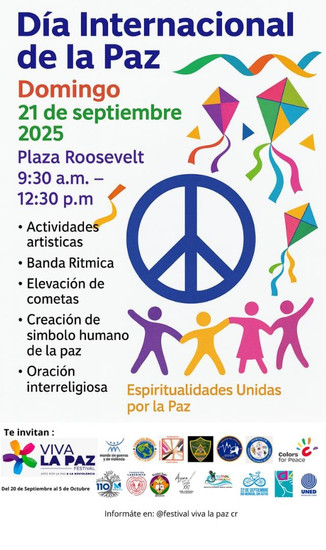 21 Sept-San José (CR) — , Plaza Roosevelt, 9:30–12:30 "Viva la Paz" festival day with artistic activities, rhythmic band, kite flying, human peace symbol, and inter-religious prayer.