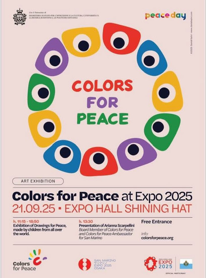 21 Sept — Expo 2025, Expo Hall “Shining Hat”: 11:15–18:50 Exhibition of Drawings for Peace and a 13:30 presentation by Arianna Scarpellini, Colors for Peace Board Member and Ambassador for San Marino. Free entrance.