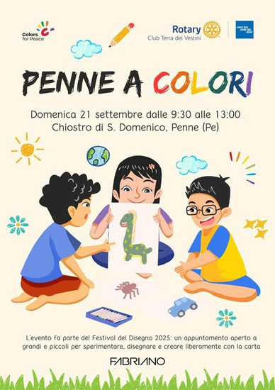 21 Sept-Penne, Pescara (IT) 9:30–13:00: "Penne a Colori" with Rotary Club Terra dei Vestini at the Chiostro di S. Domenico — part of Fabriano’s Festival del Disegno 2025.
