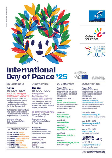 20 set — Roma, Parco Archeologico del Colosseo (Via Sacra), 10:00–12:00 Inaugurazione di Colors of Peace con disegni per la pace realizzati da bambini di tutto il mondo, sotto l’Alto Patrocinio del Parlamento Europeo. Alle 12:00: partenza della Fiaccola della Pace (Peace Run).